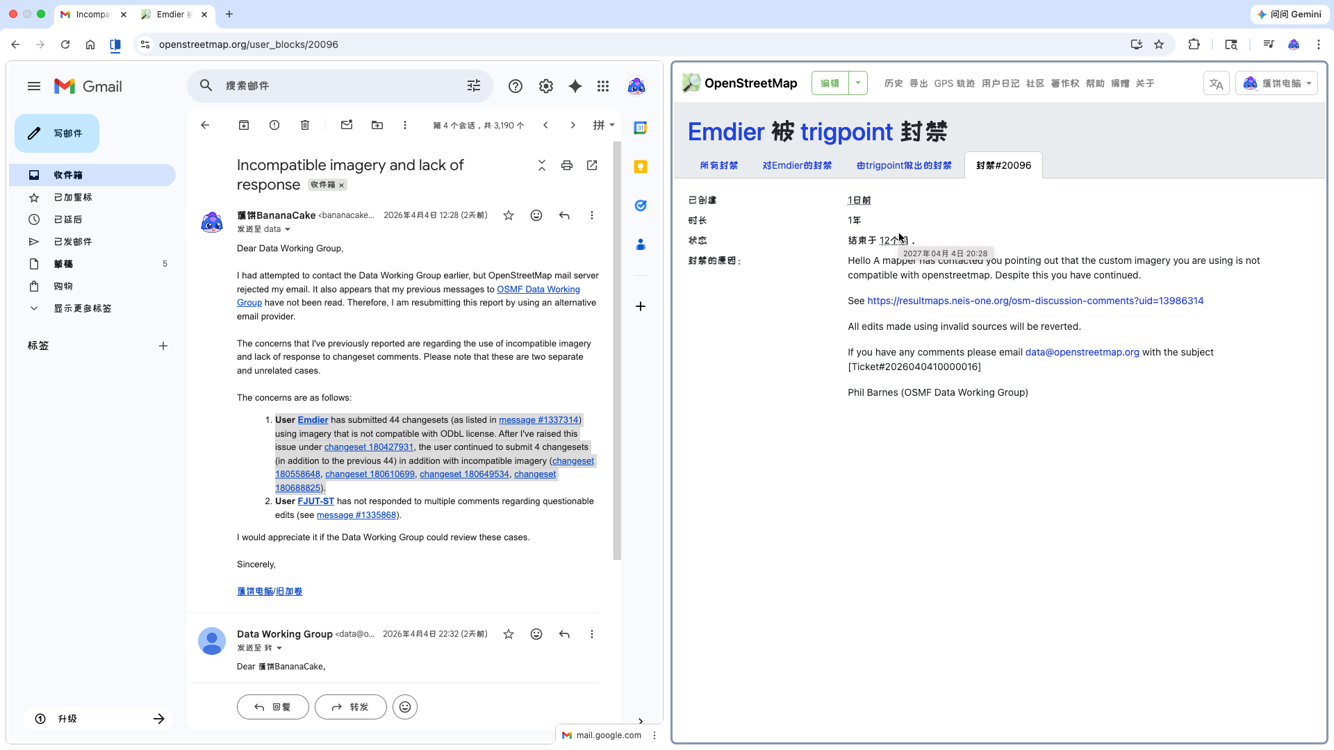 我最早于3月26日通过OpenStreetMap私讯向OpenStreetMap数据工作组提交了举报,后重新使用电子邮件提交了举报。举报理由是其使用了有版权限制且与OpenStreetMap所使用的ODbL许可证不兼容的底图。当然,明眼人都能看出我举报的真实目的是反制对方标注军事要素的行为,我只是找了一个对于数据工作组成员来说有效的理由罢了。既然OpenStreetMap“开放”,社区自然是不会反对用户上传军事要素数据,但如果是使用了不兼容ODbL许可证的数据,仲裁员就会表现的像是地图数据库被玷污了一样。